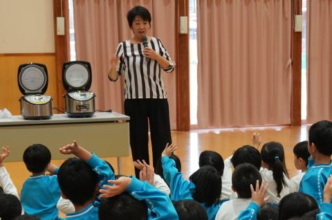 お話が進むにつれて、炊きたてのお米の香りがふんわりと漂い始めると、子どもたちからは「いいにおい〜!」と嬉しそうな声が。紙コップに盛られたご飯を手に、「♪おこめおこめ」の歌に合わせてシェイク!歌が終わる頃には、まんまるのおにぎりが完成していました。