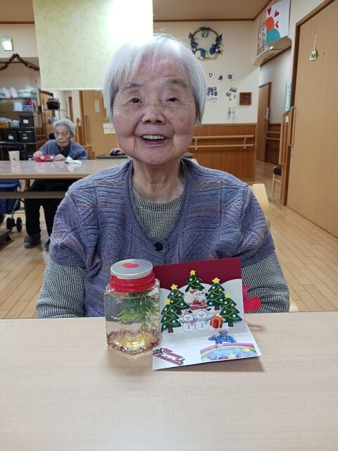 12月25日、クリスマス会を開催しました。まずは職員によるクリスマスソング演奏。皆さんで『マイスノードーム』作りをし、クリスマスカードと一緒にプレゼント。 おやつには、クリスマスケーキを食べ、ささやかながら楽しいひとときとなりました。