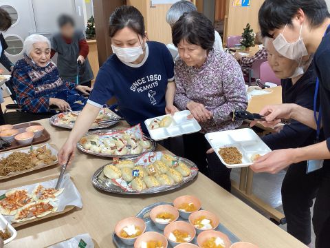 昼食はバイキング形式で、普段とは違う特別なメニューをお楽しみいただきました。ピザや唐揚げ、焼きそばなどなど。皆さん好きなものを好きなだけ取って美味しそうに召し上がっていました。