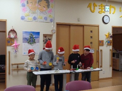 2026年01月05日 冬の思い出 ♪クリスマス会♪ ひまわりこどもクラブ こどもクラブのみんなでクリスマス会を開催しました。みんなで手作りのオーナメントを作りツリーへ飾ったり、おじいちゃん、おばあちゃんたちへハンドベル演奏を披露しました♪ また、新聞紙を使ったゲームで大盛り上がり! お楽しみのお菓子パーティーではみんなで「メリークリスマス!」の合図で乾杯しケーキやお菓子を美味しく頂きました!